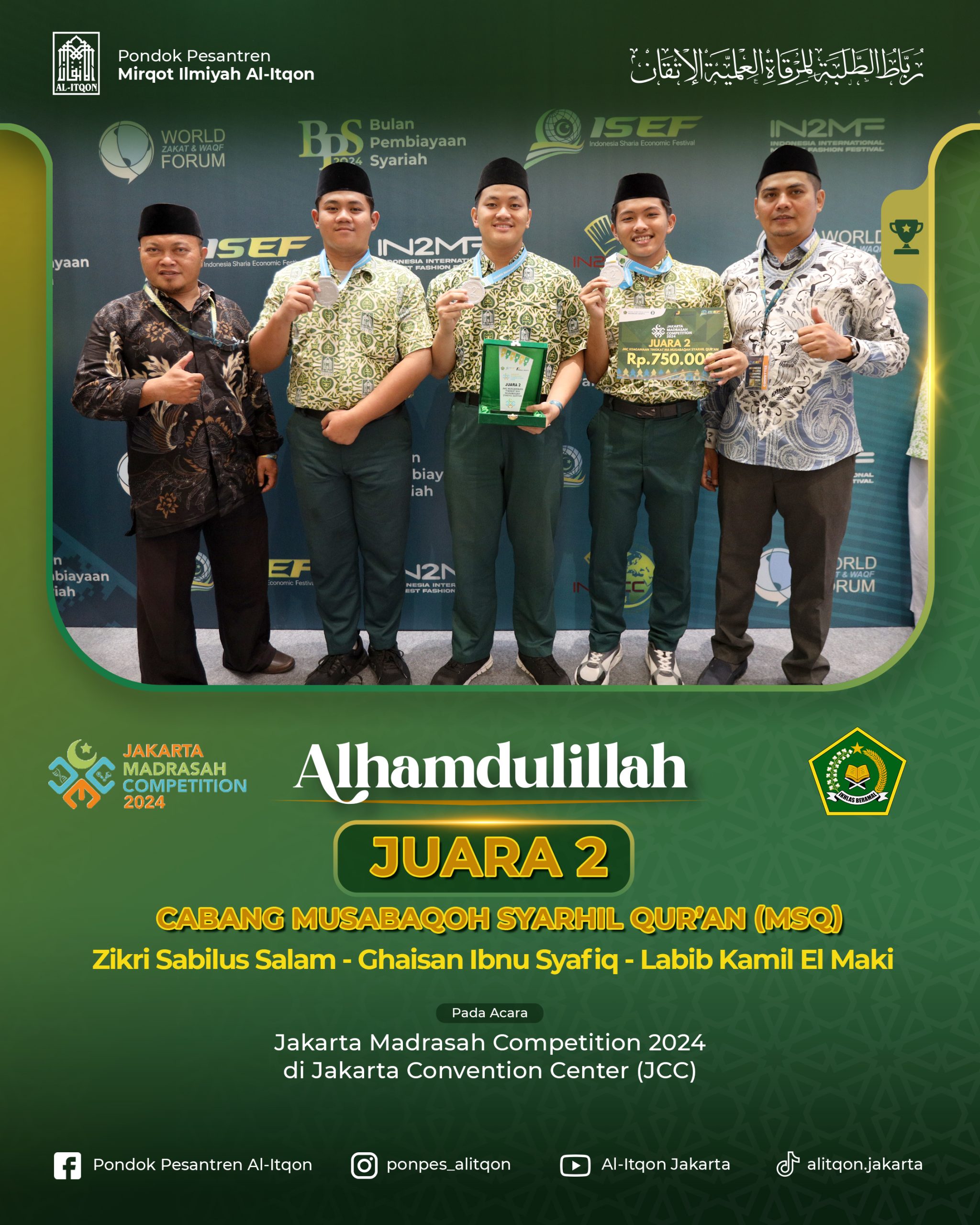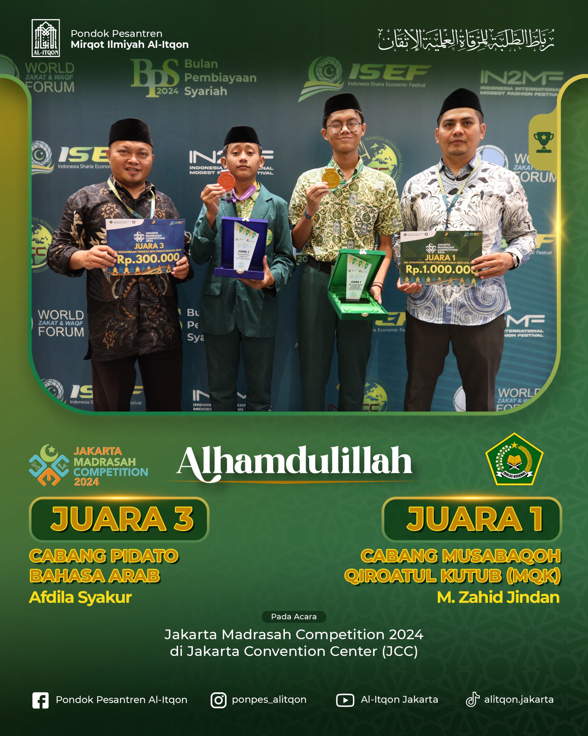Dengan penuh semangat dan perjuangan, Ghaisan Ibnu Syafiq santri Al-Itqon berhasil meraih Juara 3 dalam ajang MTQ Nasional...